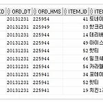 주문번호를 내림차순으로 최근 주문데이터 10건 출력하기 * 결과값 * 쿼리1SELECT OI2.ORD_NO, O.BRANCH_CD, OI2.ORD_DT, OI2.ORD_HMS, OI2.ITEM_ID, I.ITEM_NM, OI2.ORD_ITEM_QTY FROM ( SELECT RID FROM ( SELECT ROW_NUMBER() OVER(ORDER BY ORD_NO DESC) RNO, ROWID RID FROM ORD_ITEM ) OI WHERE OI.RNO