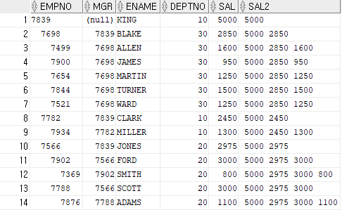 | SELECT LPAD(' ', 2*(LEVEL-1))||EMPNO EMPNO, MGR, ENAME, DEPTNO FROM EMP [WHERE EMPNO != '7844'] // 최종 결과에서 EMPNO가 7844인 데이터 제외 START WITH MGR IS NULL CONNECT BY [NOCYCLE] PRIOR EMPNO = MGR [ORDER SIBLINGS BY 컬럼명]; |