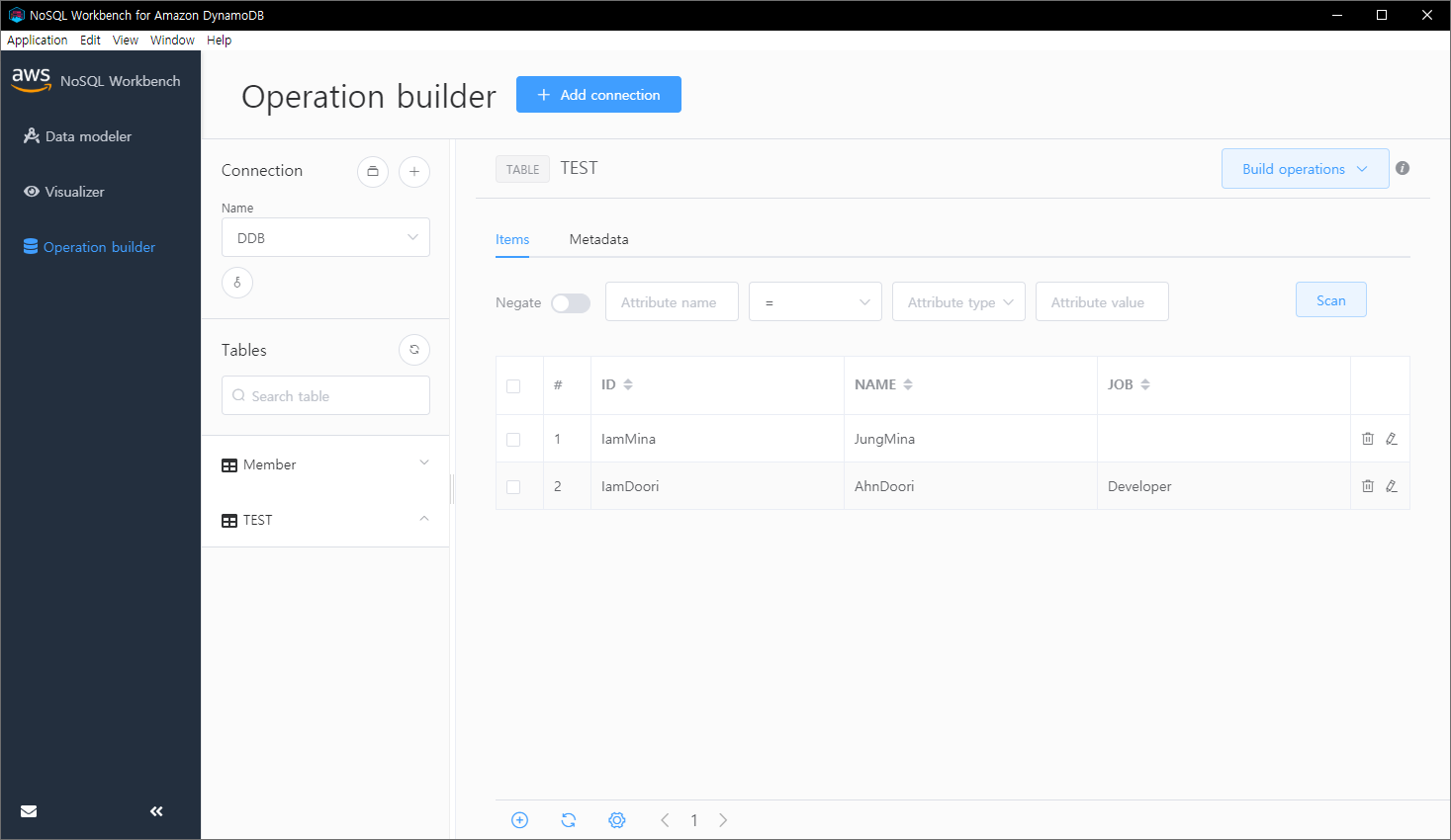 import { table, hashKey, rangeKey, attribute } from '@aws/dynamodb-data-mapper-annotations'; @table('TEST')class TableMapper { @hashKey() ID?: string; @rangeKey() NAME?: string; @attribute() JOB?: string; } export default TableMapper; |